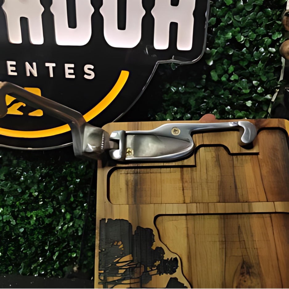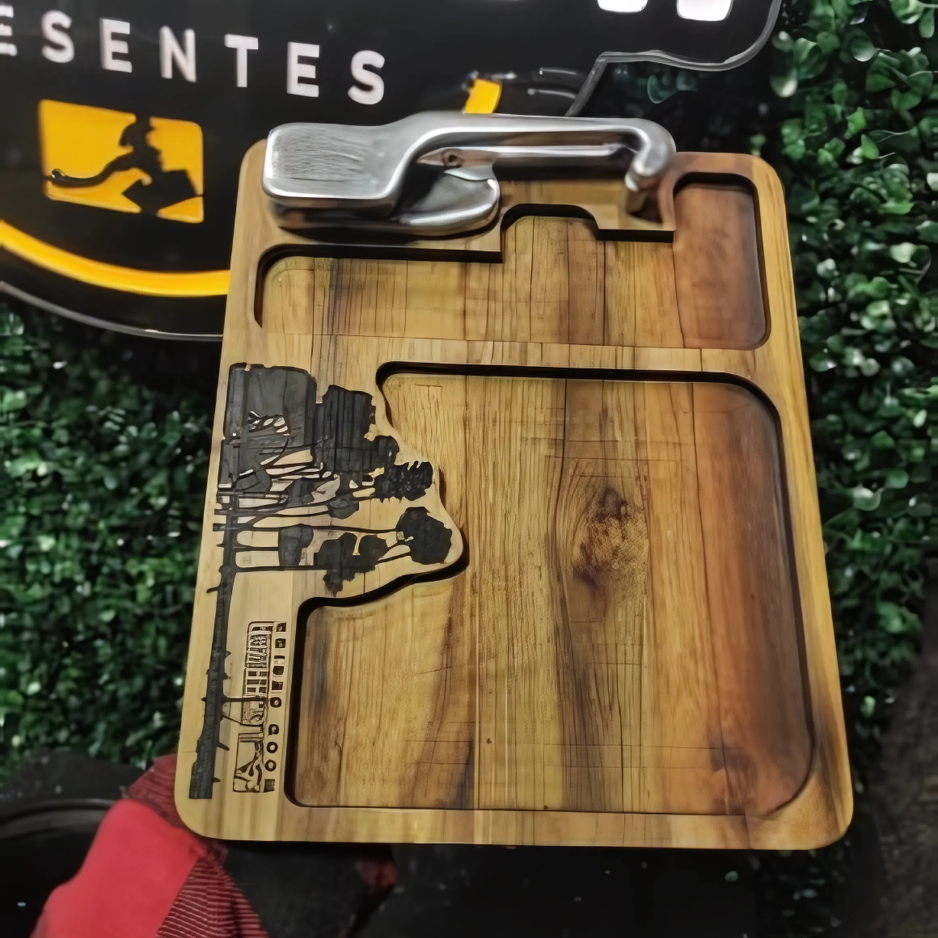 Este Descascador de Pinhão combina funcionalidade e beleza, feito especialmente para facilitar o processo de descascar pinhão com praticidade. A base de madeira de teca garante resistência e durabilidade, com dois compartimentos que organizam perfeitamente as cascas e os pinhões descascados.. O detalhe do pé de Araucária gravado a laser adiciona um toque rústico e sofisticado, trazendo um pedaço da natureza para sua cozinha.